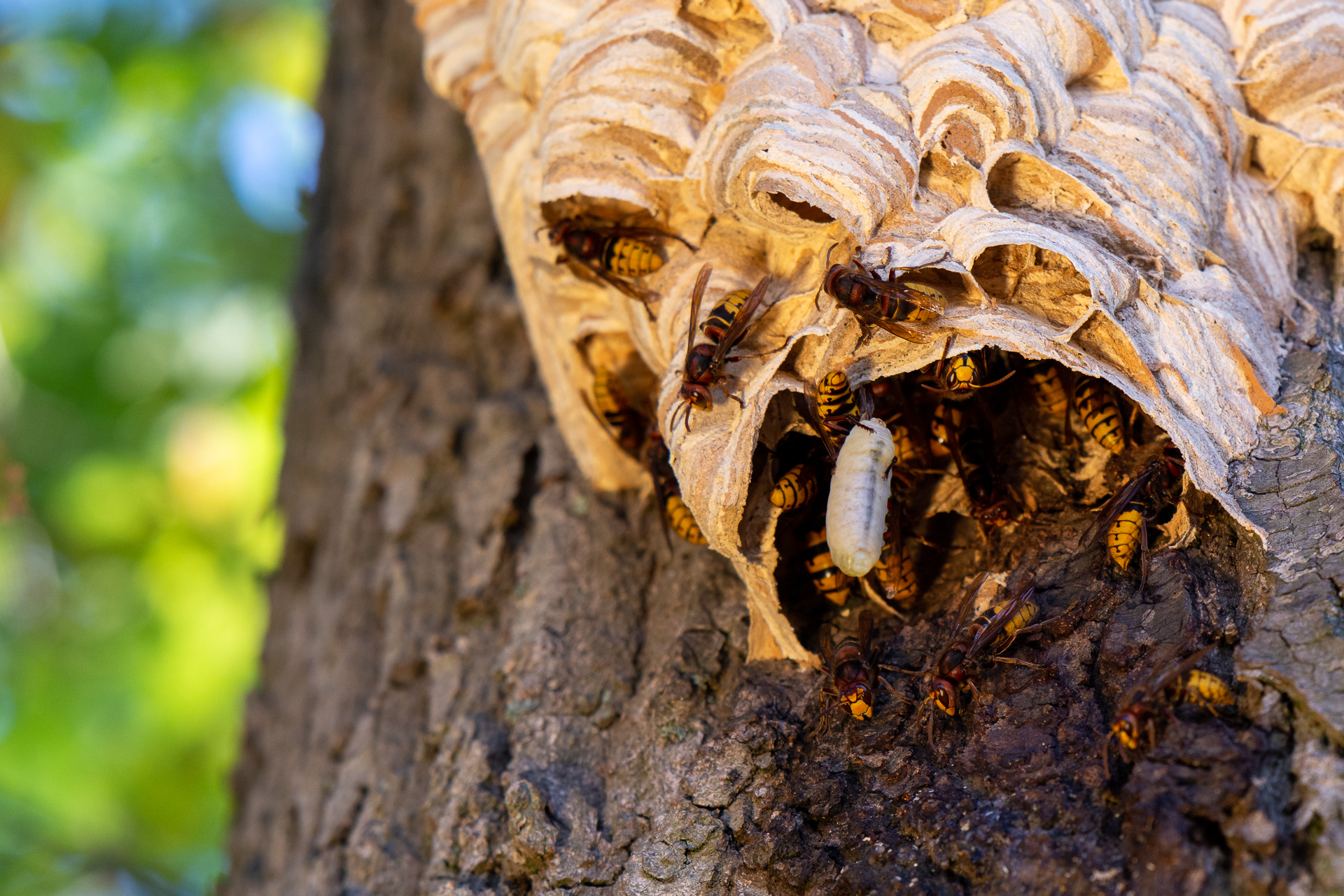 While photographing a nest of European hornets (Vespa crabro) high up in a tree, I suddenly noticed a large white grub being pulled out of the nest by a worker. For a few moments it was hanging there, then it was let go and fell to the ground. I searched the grass and found it. It was one of their larvae and had been injured by the fall. Possibly the larva was sick, or it had been fed by the workers, but did not return the rewarding sugary secretion that sustains the workers. I used a reflective screen to illuminate the inside of the hive. Many people fear hornets due to them being larger than wasps. In recent years, the Dutch news has published many fear mongering articles about the presence of the invasive Asian hornet, which harms the public opinion on the native hornet species as well. More positive publicity is urgently needed to preserve this species, which is an important predator of many insects, including pest insects such as mosquitoes and flies.